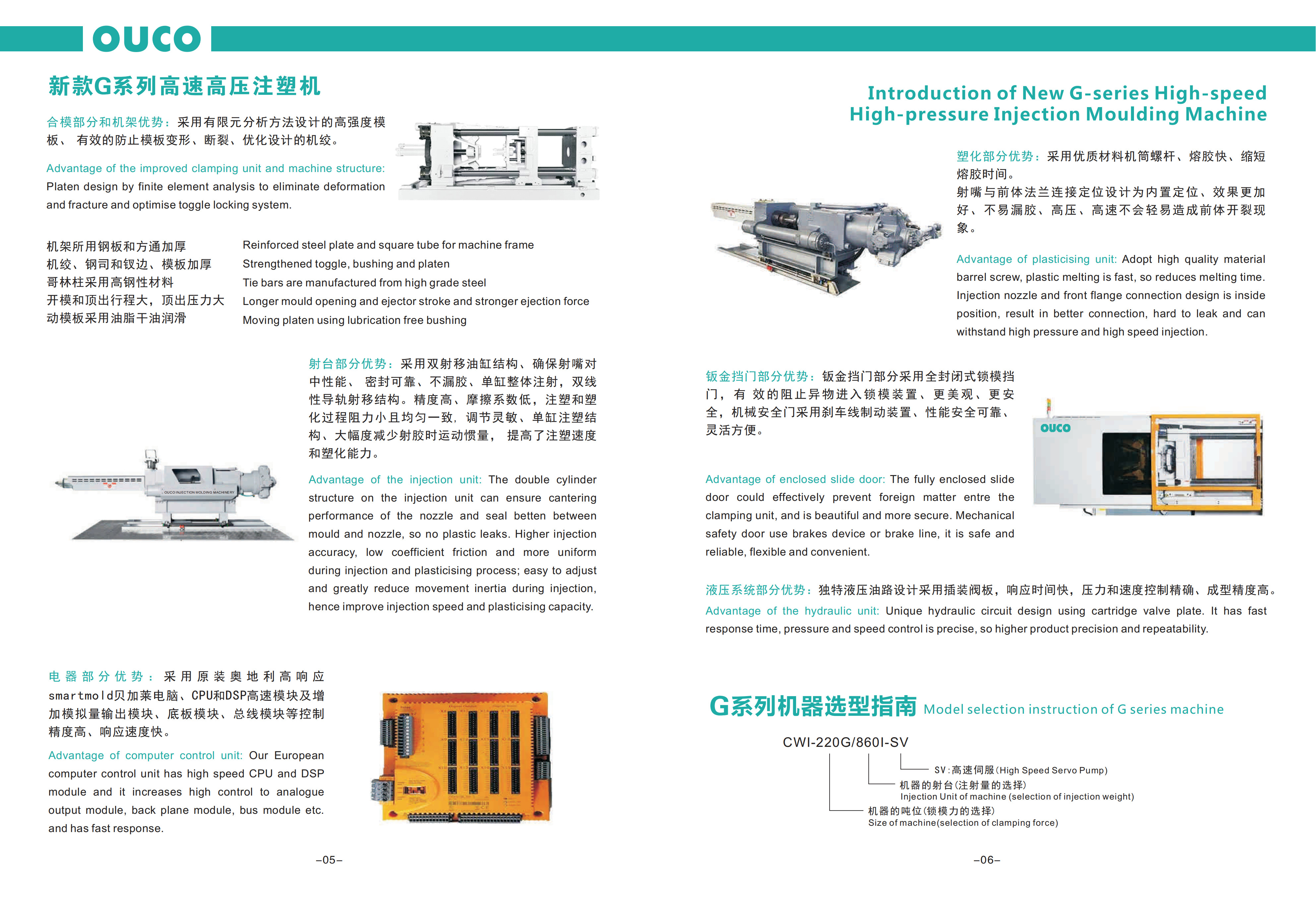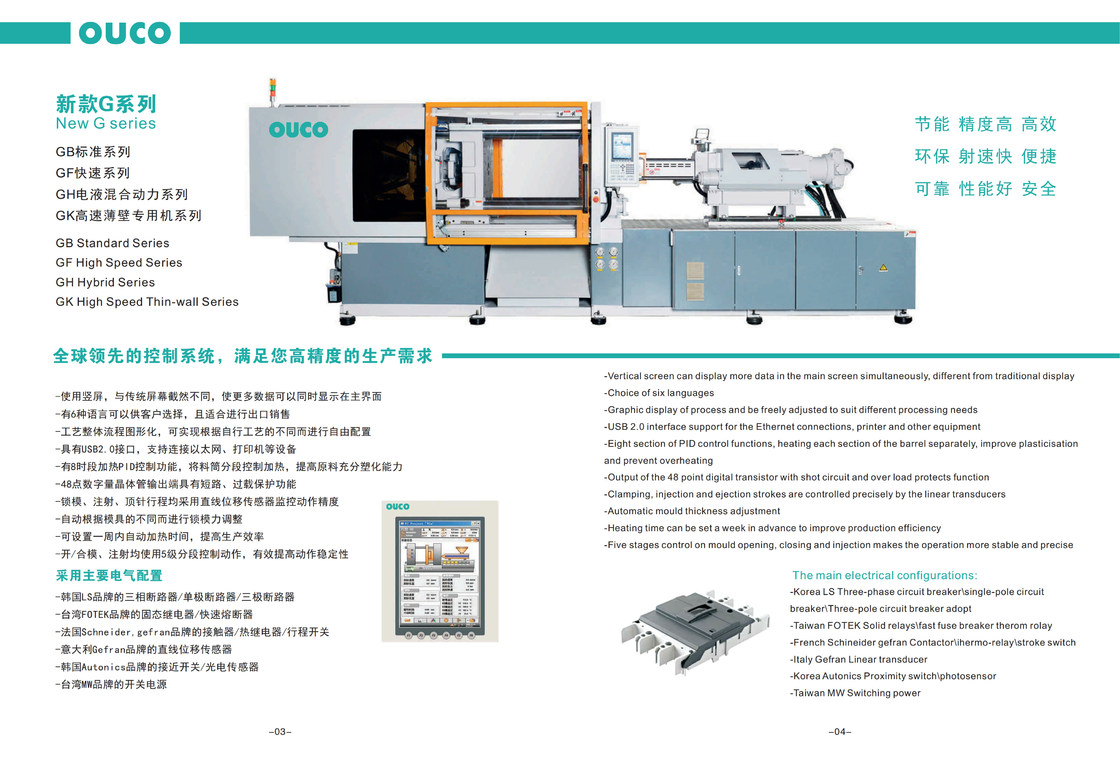 OUCO สร้างผลิตภัณฑ์ G-Series ใหม่ด้วยมาตรฐานยุโรประบบประหยัดพลังงานเซอร์โว SV มีข้อกำหนด 8 ข้อพร้อมแรงยึดตั้งแต่ 110 ตันถึง 600 ตันแต่ละข้อกำหนดสามารถเลือกได้ด้วยโครงสร้างการฉีดที่แตกต่างกัน 2 หรือ 3 แบบตามความต้องการผลิตภัณฑ์ของลูกค้า